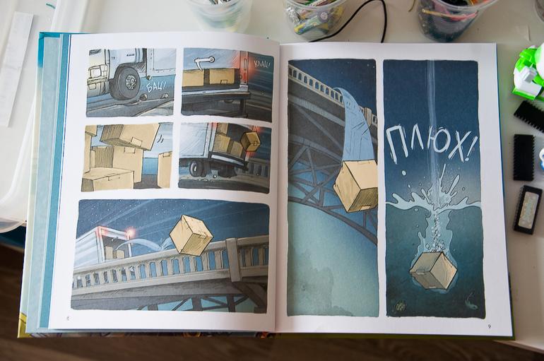 Завораживает сама подача мысли в комиксах. Вот в обычном тексте тот факт, что коробка соскользнула с грузовика и упала в воду, заняло бы не больше 2-3 предложений. А тут целый разворот... Нет, это не книга. Это кино. И каждый кадр важен. Вот машина наехала на камушек, коробка качнулась, падает, отскакивает и в воду! Магия!