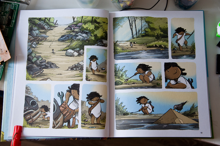 Легкий постапокалипсис. Почему-то в детских книгах тема настойчиво эксплуатируется. Свалки, брошенная техника. И там гуляет девочка, находит свои спрятанные инструменты. Явно дома ее увлечение не приветствуют. И вот она замечает что-то. Коробку.