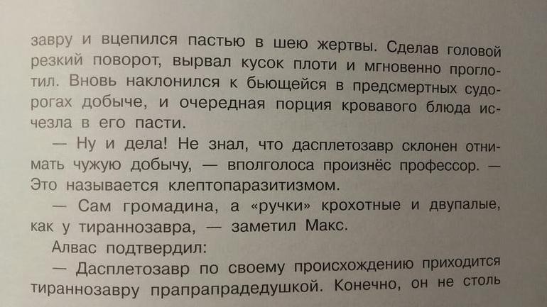 Хочу предупредить, что есть описания как хищник поедает мирного динозавра, как он тухнет на воздухе, как копашаться и доедают его жуки, ничего в этом страшного не вижу, это естественный процесс, но для 6тилетки немного меняла и упрощала текст.