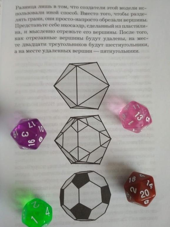На картинке мы видим, как получается шар (футбольный мяч) из икосаэдра (верхней фигуры). Обратите внимание, черные многоугольники - пятиугольные, а белые - шестиугольные. Это получается из-за отсечения «лишних» вершин икосаэдра, а я, если честно, никогда не обращала внимания на различия в количестве граней. Но иначе шарообразной фигуры не получить.