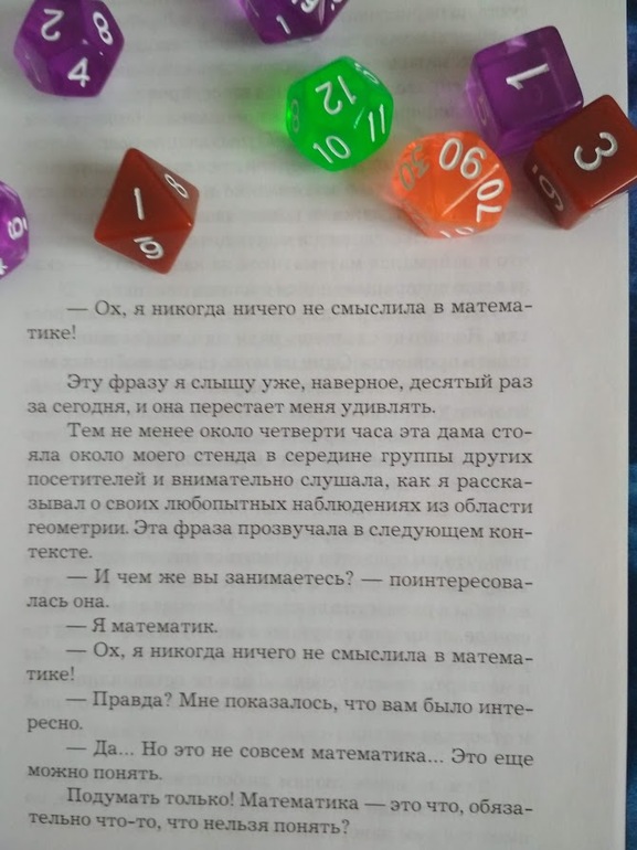 Книга начинается словами одной из слушательниц. «Ох, я никогда ничего не смыслила в математике!» Эти слова я тоже слышу довольно часто. Мне кажется, люди произносят их, даже не задумываясь, а между тем… математика - это интересно, математика - это красиво, математика - это просто!