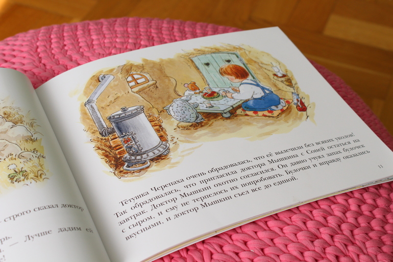А еще в этой истории очень юмористичный конец. Доктор Мышкин так объелся угощений, что у него разболелся живот. Добрая Соня, конечно, вылечила звериного доктора, который, как оказалось, сам боится уколов.