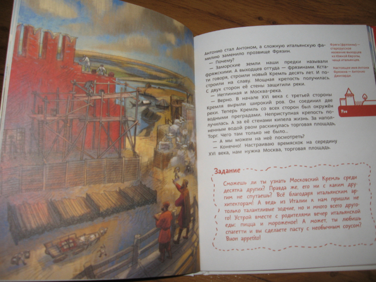 В конце каждой главы есть задание. Например, построить Кремль из кубиков или устроить вместе с родителями вечер итальянской кухни, а можно и собственную летопись написать, ну, в крайнем случае, надиктовать маме, а самому потом проиллюстрировать. В общем, идей тоже куча, но мы пока не реализовали ни одной. Но это пока мы в рабочую колею не вошли с учебой и прочим.
