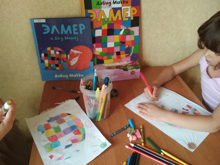 Маша терпеть не может раскраски, но Элмера честно разрисовала, даже добавив немного креатива. Алёна тоже... присутствовала и добавила несколько завершающих штрихов в виде мокрых пятен и дырок)