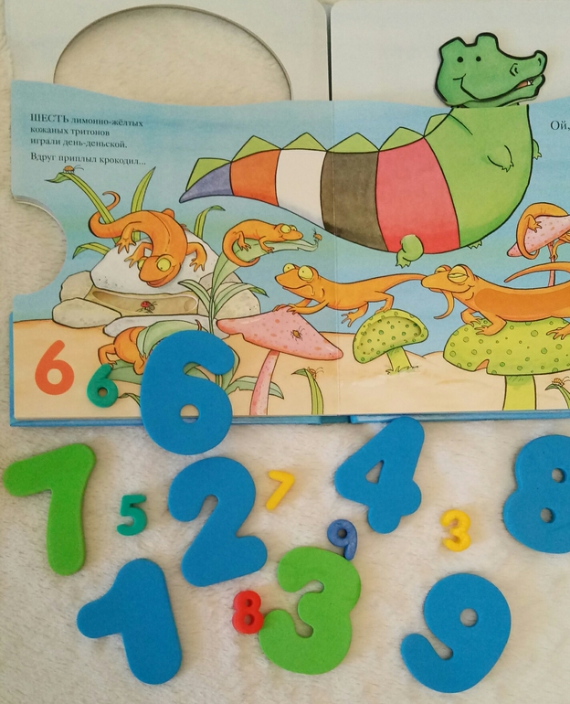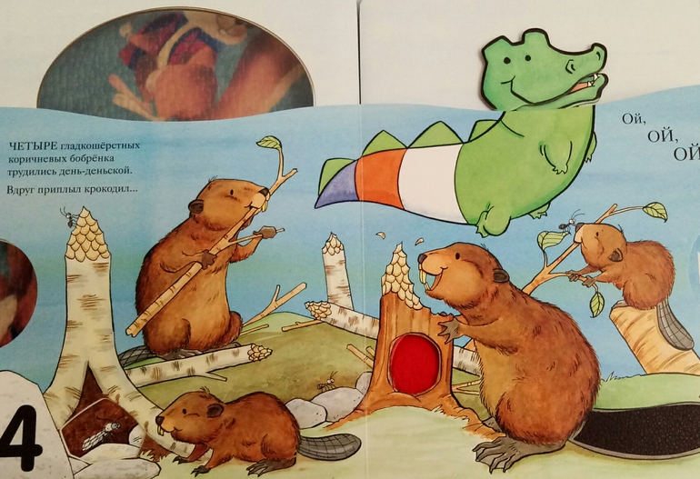 А мы с каждым разворотом учим новое число, или повторяем уже знакомое) Один, два, три, четыре, пять мы знаем хорошо, а дальше начинается разброд и шатания, семь, девять, шесть, восемь) так что можно сказать, что книжка нам все таки по возрасту) а еще в книге дырочки- окошки, и вот пень превращается в пушистый хвост