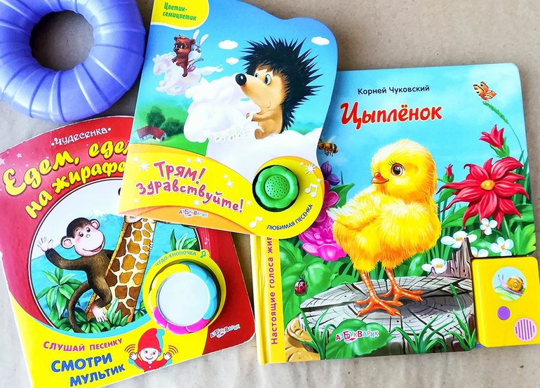 Их у нас было немало, но долго они, увы, не живут. Визуально очень редко попадается что-то достойное, у нас остались вот такие. Нам нравятся «Едем, едем на жирафе» (с короткими стихами про животных и песенкой) и «Цыпленок» (говорящая книжка). Ни та, ни другая уже не говорят, хотя до сих пор любимы. Недавно я взяла «Трям, здравствуйте» (в Озоне), но, если честно, мне она не очень нравится. Изображения в ней мутноватые и скучноватые, хотя песенку Катя включает.