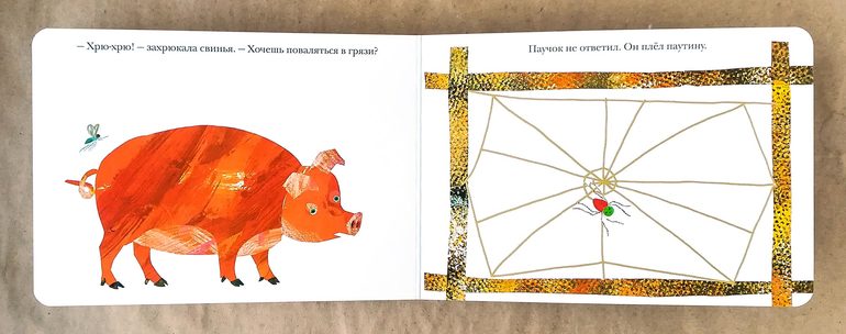Еще одна книга Эрика Карла. И опять в точку! Самое оно для малышей. Здесь и жизнь паучка, и разные животные (на каждой страничке по одному). Нарисована книга в той же те технике, что и «Голодная гусеница», что определенно нравится детям, да и мне.