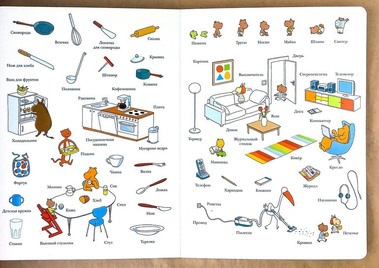 Большая книжка-разглядывалка с картонными листами. Множество предметов на разные темы, например «дом», «транспорт», «спорт», «фигуры и цвета» и др. Некоторым не нравится, что здесь домашними делами животные занимаются, но по мне так у нас во всех сказках животные к человеку приближены. И детям это нравится. А столько предметов и новых слов сложно еще где-то найти.