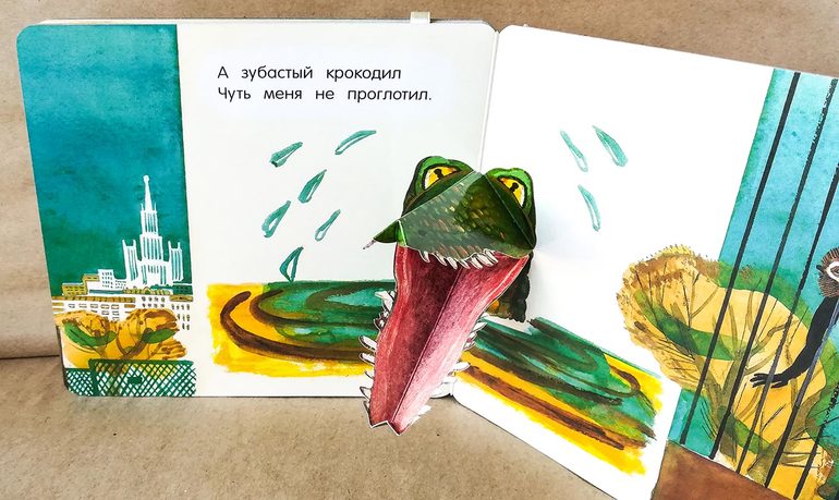 Знаменитое стихотворение про зоопарк. И книга оригинальная, спасибо за отличную идею! Это не просто книжка-картонка с хорошими иллюстрациями. Это книжка-игрушка. Здесь есть воробей на ленточке, который может вместе с вами перелетать со странички на страничку и обедать у разных зверей. А в конце воробья поджидают острые картонные зубы почти настоящего крокодила! Крокодил здесь - объемная бумажная конструкция, открываешь разворот, и крокодил двигает своей пастью.