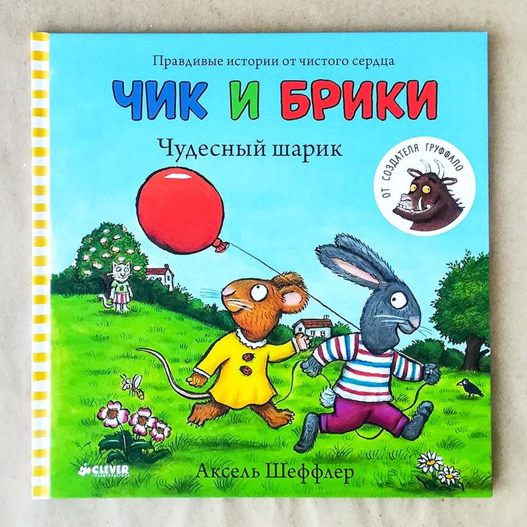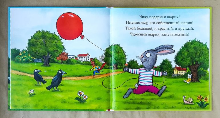 Это целая серия забавных рассказов про зайчика Чика и его подружку-мышку Брики. У нас пока только история про шарик, но явно будут еще! Мы с Ксюшей обожаем книги Джулии Дональдсон и Акселя Шеффлера, но они все же на чуть постарше. А тут такой подарок для малышей от художника Акселя Шеффлера! Книга яркая, веселая, с эмоциями, с переживаниями. Коротенькая история про то, как Чику подарили шарик, а он его случайно выпустил. Конечно, Брики обязательно поможет своему другу и все закончится хорошо.