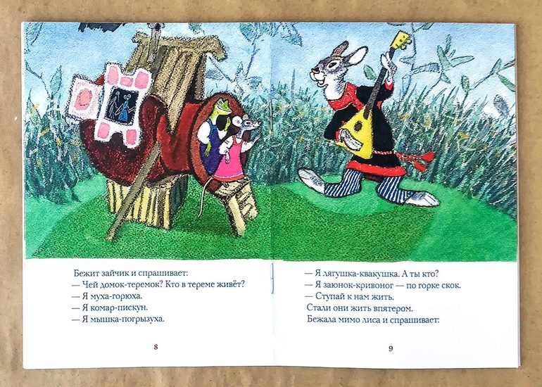 Текста пока нам многовато, так что я в сокращенном виде рассказываю. Прозвища, кстати, здесь тоже есть тяжеловатые: заяц - на горе увёртыш, волк - из-за кустов хватыш, но можно и заменить на свои при желании. Бонусом, кроме «Теремка», здесь еще несколько забавных стишков-потешек про зверят.