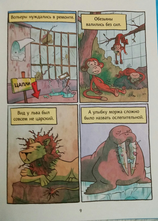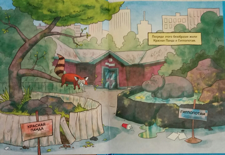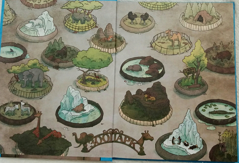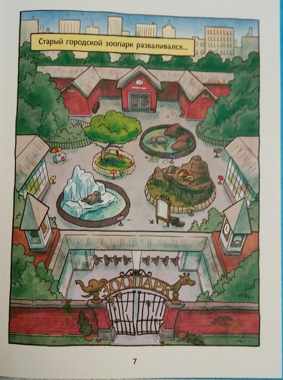 Книга начинается с такого достаточно грустного форзаца, где изображен городской зоопарк не в самый лучший свой период