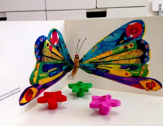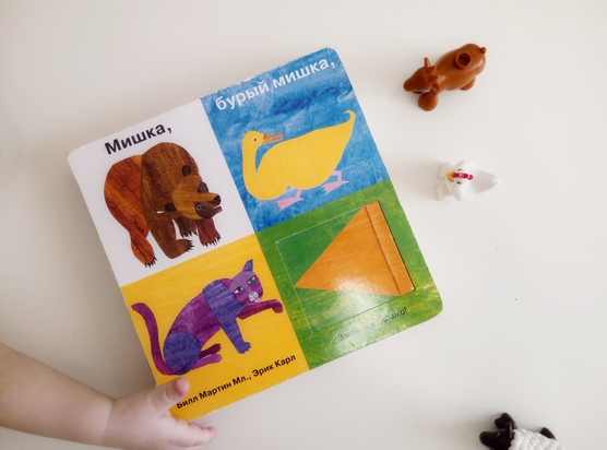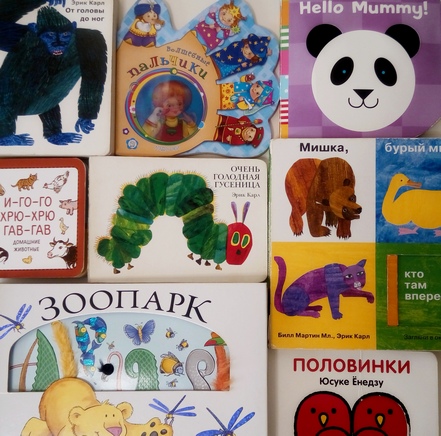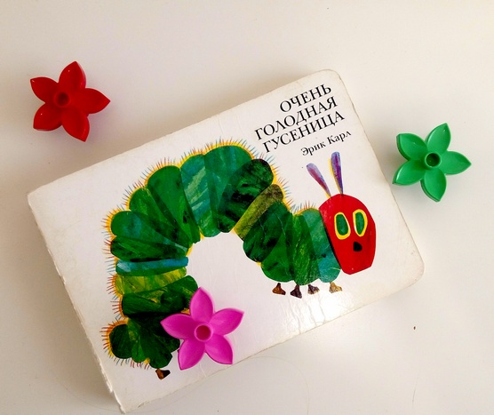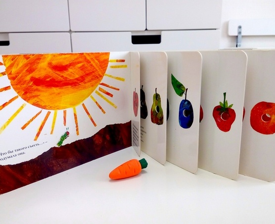 Первое почетное место в нашей коллекции занимает Оочень маленькая и ооочень голодная гусеница. Тут мы не оргинальны. Гусеницу эту любят во всем мире. И несмотря на то, что многим мамам иллюстрации Эрика Карла кажутся, по меньшей мере, странными, эта книжка - абсолютный маст-хэв! Судите сами: по этой книжке можно изучать фрукты, счет, дни недели, противоположности, жизненный цикл бабочки и даже основы правильного питания. И все это на 10 картонных страничках!