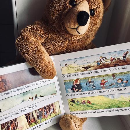 Этой книжкой можно увлечь практически любого ребенка. Ну какой малыш откажется пошуршать травой, поплюхаться в речке и повыть вместе с метелью? А в тот момент, когда путешественники встречают в пещере медведя, обычно раздается дружное громкое "Аааааа!!!"