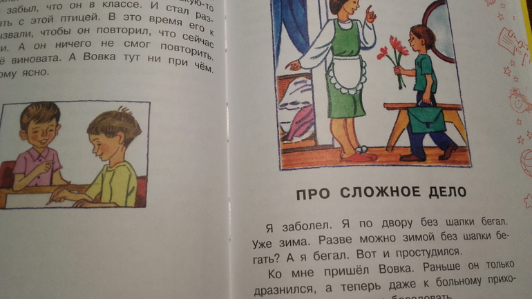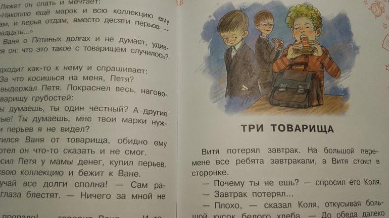 Отличный получился сборник. Очень много различных ситуаций и случаев, которые могут произойти с вашим ребенком в школе ежедневно, о каждом рассказе хочется говорить и обсуждать. Хороший шрифт и междустрочный интервал, буква Ё, легко читать, удобно держать, легкая, плотная бумага, хорошие иллюстрации. Рекомендую)