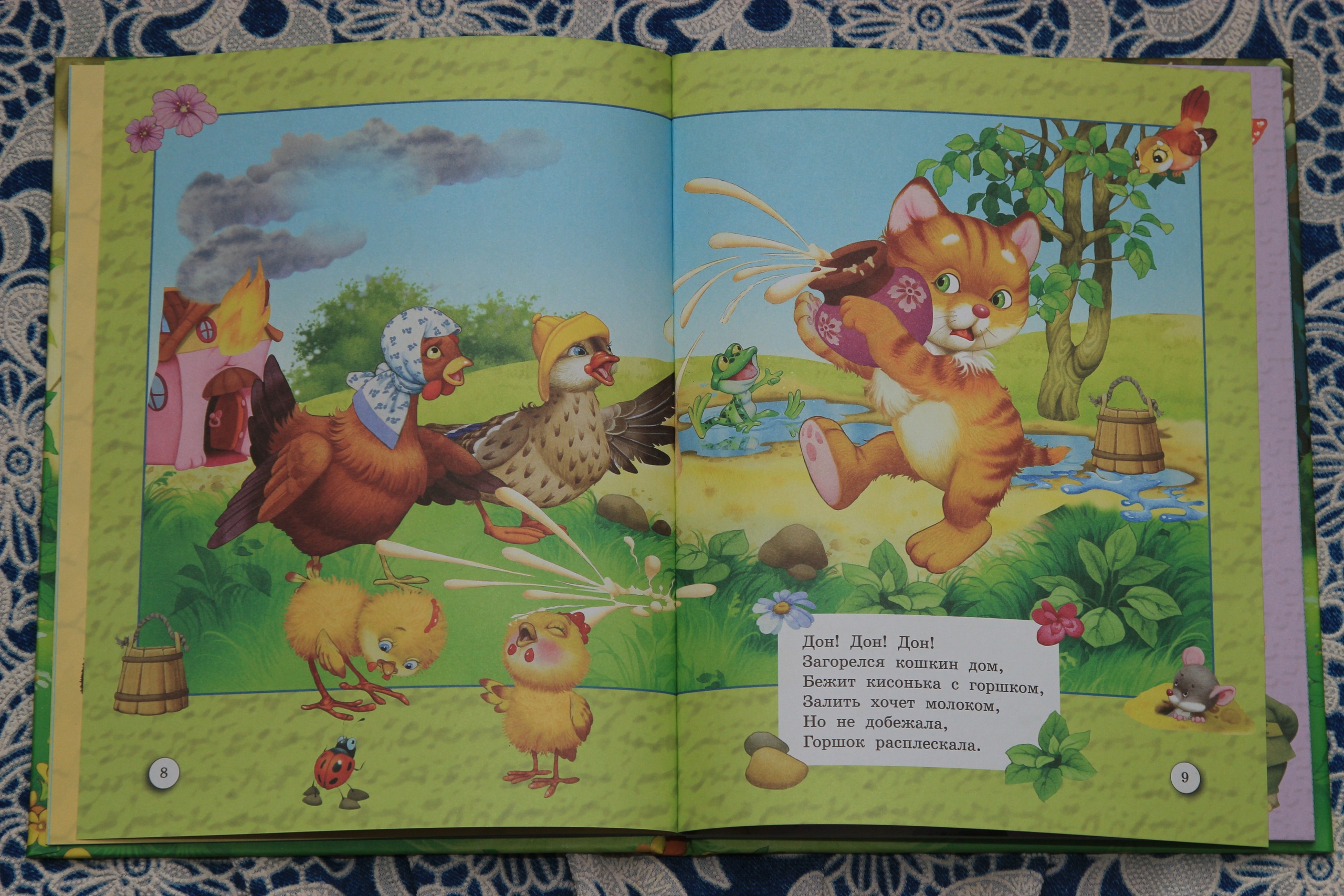 «» - небольшой по содержанию сборник, в котором есть ритмичные стишки, сказки и даже песенка. Первое стихотворение «Кошкин дом» я читаю впервые. Оно для самых маленьких: минимум текста, максимум картинок и повторы. А еще эффект неожиданности на каждой странице.