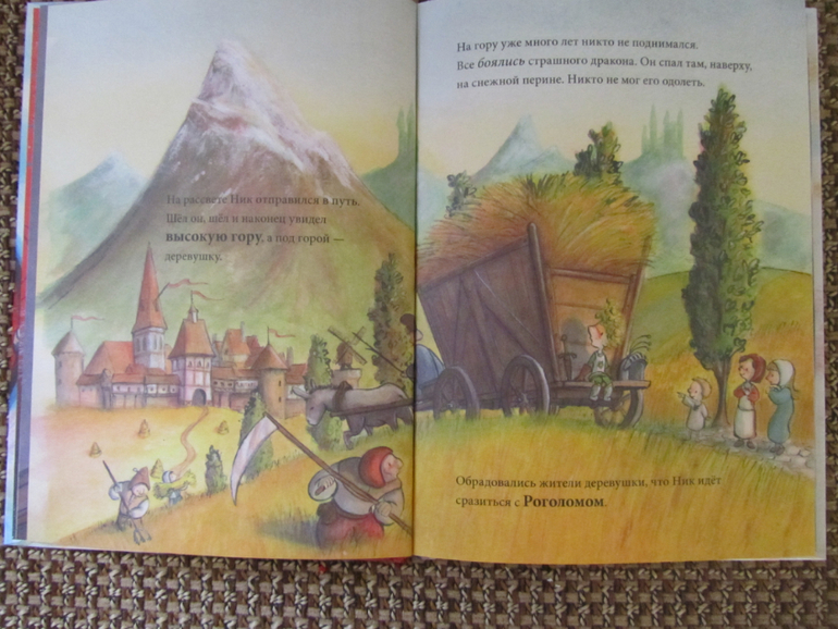 Я конечно не смогла пройти мимо книги про героя, которого зовут как сына, а нашего Никиту мы сокращенно именно Ник и называем, да ещё и рыцаря, это прям наша тема ))) История маленького, но храброго рыцаря, который не побоялся сразиться со страшным драконом живущем на горе и наводящим ужас на всю окрестность. Чтобы быть достойным соперником рыцарю пришлось приложить немало усилий, и когда он наконец был готов к сражению, всё пошло совсем не так ... Дракон вовсе не хотел сражаться, он хотел...играть! И эта тема нам очень близка, мы те ещё настолкоманы ))) Кстати Ник всё таки победил дракона...выиграл у него пару партий в шахматы)) Иллюстрации очень милые, рыцарь получился такой трогательный, а дракон со сломанным рогом вообще милашка )) В общем книга такая маленькая (по формату как истории про Полли и Нейла), но такая чудесная, сыну очень понравилась ))