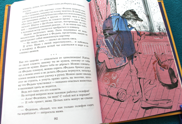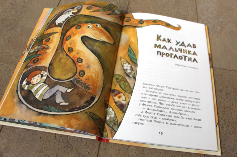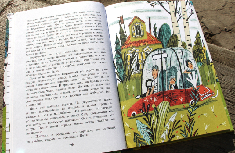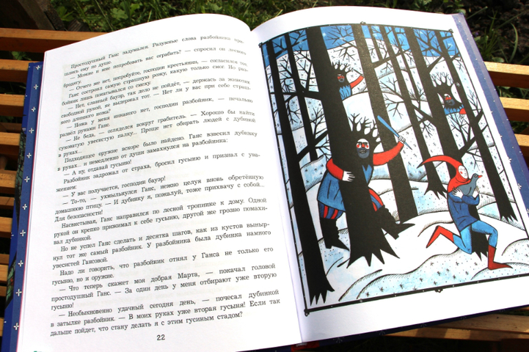 Крупный шрифт, небольшие рассказы, цветные и не очень иллюстрации. Иллюстрации будто бы залиты краской случайно, отчего кажутся совершенно неземными и это прекрасно поддерживает и даже усиливает странные ощущения от книги.