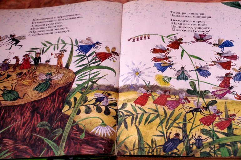 Ой, сколько хороших произведений вы вспомнили! "Муха-цокотуха", действительно, главная именинница масштабного торжества на две страницы - красивая книга.