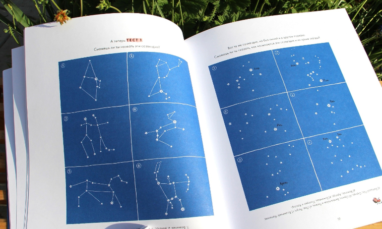 В книге даются карты звездного неба на каждый сезон (они оказывается разные))) и отдельные для каждого полушария и можно с ребенком попробовать поискать созвездия на небе. Конечно, лучше это делать не в городе. Есть интересные тесты на проверку Узнавания созвездий.