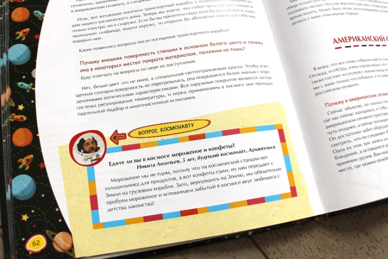 Информация очень детализирована. Такие подробности вы не найдете ни в одной детской энциклопедии - это следующий шаг в увлечении ребенка космосом и техникой. В книге дается послойное описание всего. Если читаем о корабле, то узнаем о составляющих его обшивки, где какие датчики и антенны, все устройства внутри и снаружи.