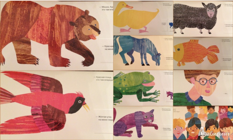А такие книги у нас вообще не в ходу, ни рисовка не нравится, ни текст лично мне. Вот у Эрика Карла есть "Мечтательный хамелеон" - то же самое "Это что за птица" Сутеева, только у него и рисунки нормальные, и смысл в книге присутствует. И образовательный компонент таких книг, на котором многие зациклены, тоже часто страдает. И если уж говорить об изучении животных, то и медведь должен быть изображен натуральный, а не это схематичное не пойми что.