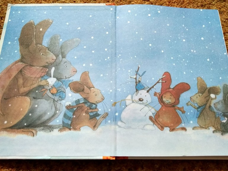 Зимний форзац с семьей смешных веселых кроликов, танцующих у снеговика, сразу создает праздничное настроение даже без наряженной елки. Для него вполне хватает снежных