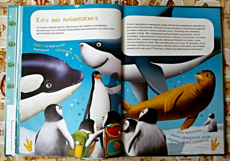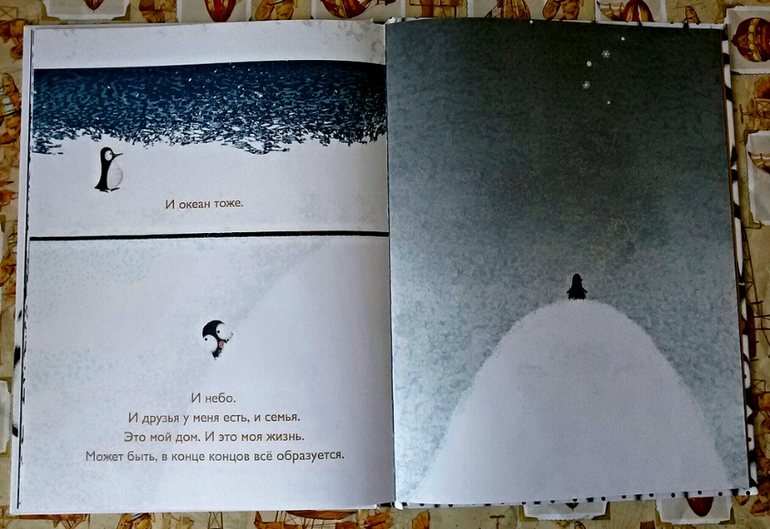 Текста в книге мало, одно-два предложения на разворот (если не считать речь моржа о том, что жизнь прекрасна на целую страницу). Но удрученно-депрессивное настроение пингвина она описывает очень точно. Бывают дни, когда я такой же букой хожу по дому и все меня раздражает.