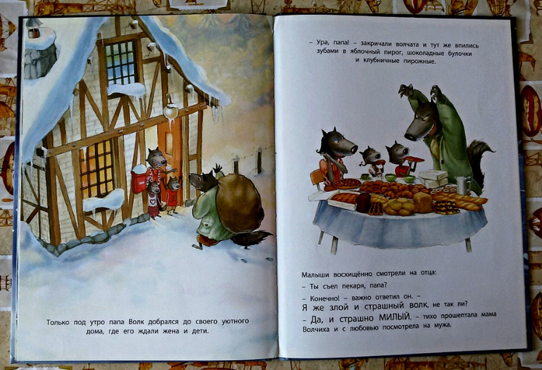 История эта безумно добрая и забавная. Небольшая рождественская сказка о великодушном волке, который темной зимней ночью отправился за чем-нибудь съестным для своей семьи.