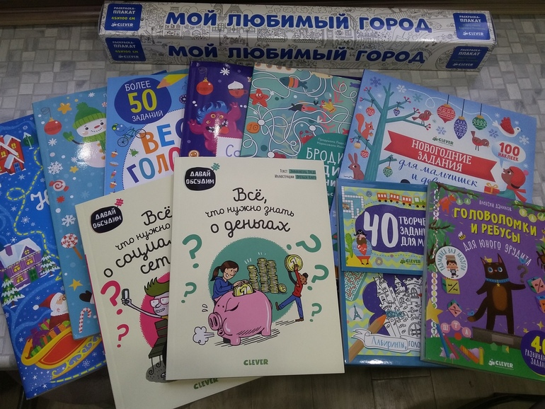 развивающая/развлекающая литератураВсе книги от издательства Clever, ездила специально в их фирменный магазин, чтобы не пропустить больше скидки: