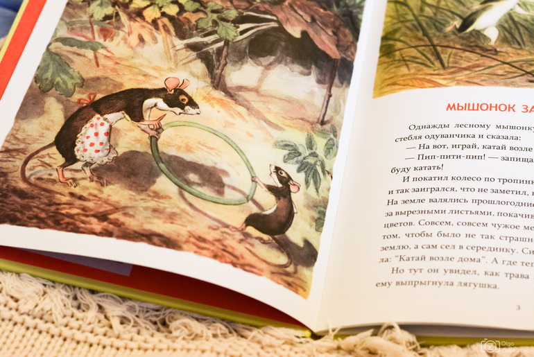 Ретро-историю про заблудившегося мышонка с колесом из стебля одуванчика мы прочитали раза три, и успокоились на том. То есть, понравилось, но без ярких эмоций. Больше всего удивило и запомнилось всем то, как смешно пищит мышонок "Пип-пити-пип". Возьмём на вооружение.