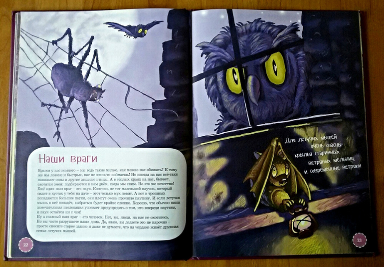 "Летучие мыши - вампиры живут в Южной Америке, у всех - морды бульдожьи, а во рту очень острые зубы - резцы. Вампиры питаются кровью птиц и млекопитающих. Летучие мыши-вампиры кровь не пьют, а лакают. Впрочем, за ночь вампир выпивает две чайных ложки крови, поэтому боятся его нечего - это никому не причинит особого вреда".
