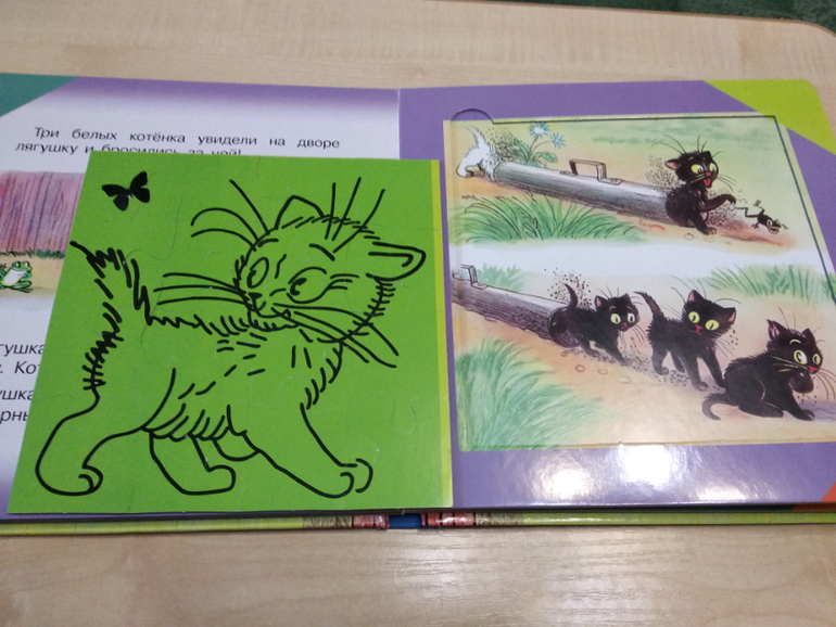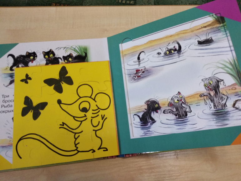 Детям книга понравилась. Просят читать сказку, собирают лицевую сторону пазлов. Со второй стороной пока не справляются. Более сложный уровень))