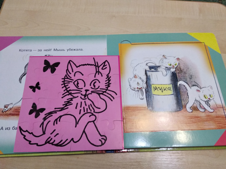 На подложке картинка основного пазла повторяется, что упрощает сборку. Пазл скрепляется очень плотно, со страницы не вываливается. С одной стороны это хорошо, а с другой, детские ручки при разборке могут повредить картинку и пазл. Как у нас и случилось. Кое-где пазлы расслоились((