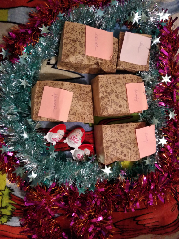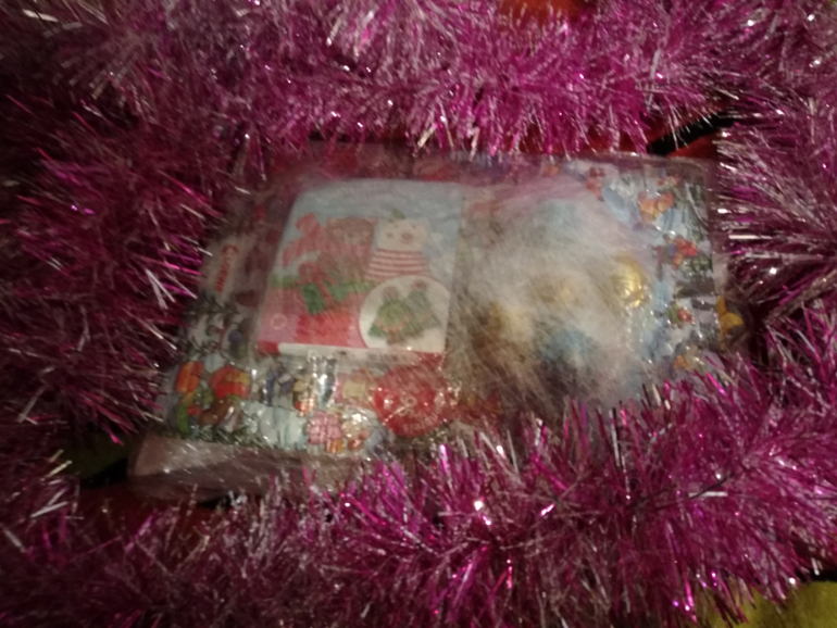 Внутри сладости и носочки, зеленые-сыночкам,радужные -маме и дочке.))