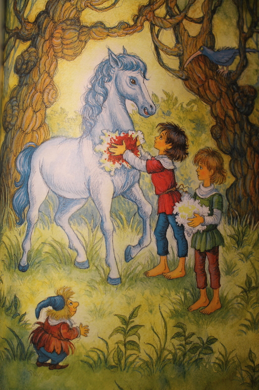 Вот Рони и Бирк лечат лошадь. Я сейчас пишу "лошадь", а Маша меня поправляет - это кобыла. Открываю страницу 106 книги и, вуаля, конечно же это кобыла. 😉