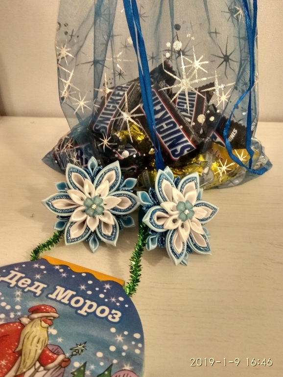 Чуть не забыла! Соня заявила, что нацепит вот эту красоту завтра в школу. Резиночки в моей любимой технике - канзаши, что в переводе означает "форменное измывательство над руками человеческими" (пробовали- знаем).