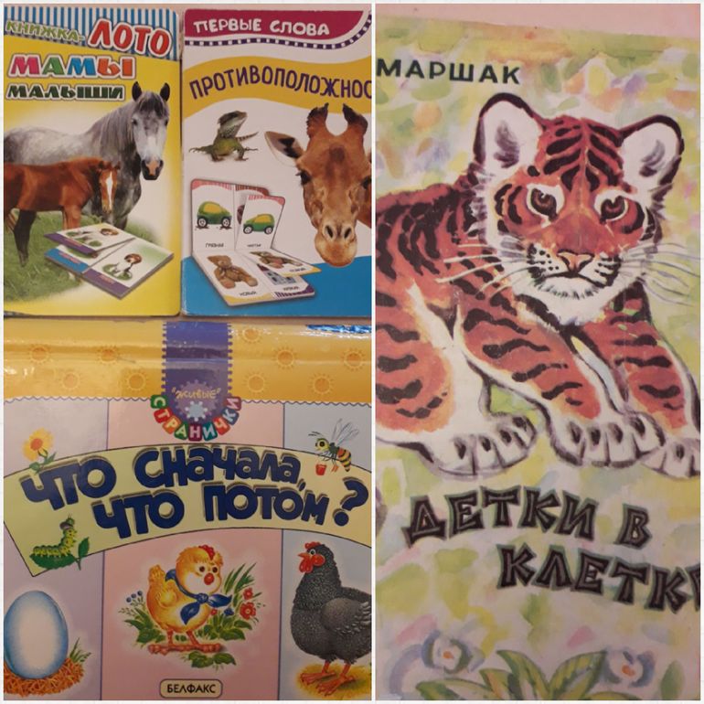 Книжечки "Мамы и малыши" и "Противоположности" очень удобно брать с собой хоть куда, а разрезанные картинки "Что сначала, что потом " и нравятся именно своими разрезанными страничками. Играем в игру а найди мне, например, корову.