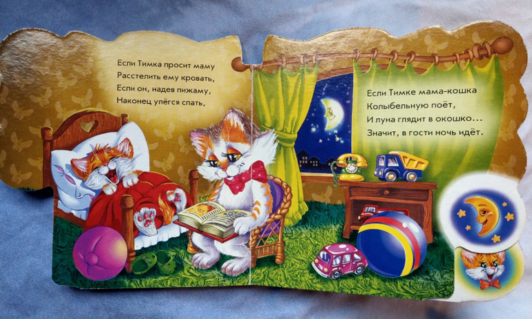 Про котенка Тима у нас две, про настроение и время суток. Вторую сын чаще открывает, особенно любит, когда я ему рассказываю, как мама кошка сыночка спать укладывает. Иллюстрации очень милые тут.