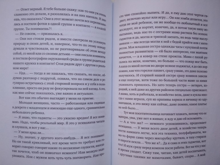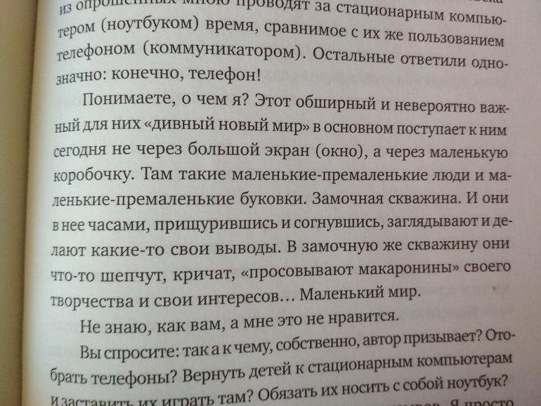 Есть в книге несколько глав, где описываются очень полезные психологические методики, но в целом практических советов вы здесь не найдёте. Зато тут много пищи для размышления, интересных наблюдений, а иногда и отрезвляющих пощёчин. Такими для меня стали главы, посвящённые гаджетам, до размера которых всё больше сжимается наш мир.
