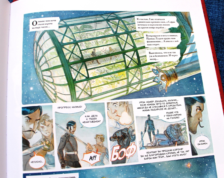 Сюжет книг мне очень понравился! Начинается каждый том с одной странички краткого содержания предыдущих томов, так что примерно я поняла, что там было. Это времена, когда ведущие европейские державы боролись за господство в Европе, когда мужчины еще ходили со шпагами и саблями, но уже появилось огнестрельное оружие. На вооружении у держав стоят разные летательные аппараты: у них суть дирижабля, но на вид это больше похоже на космические корабли с баллонами. А в предыдущих книгах ученые открыли некий эфирит, который позволил создать корабли для космических путешествий. За ним и гоняются злобные монархи.