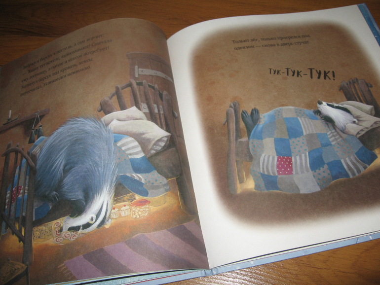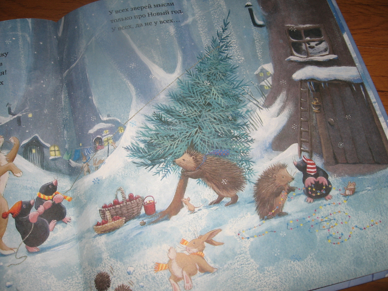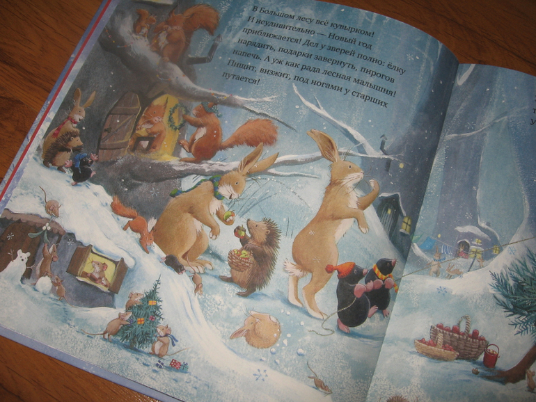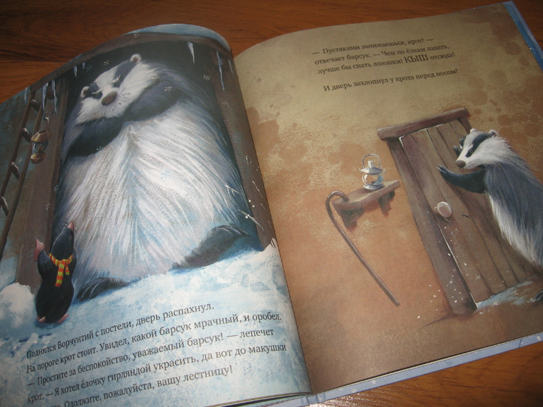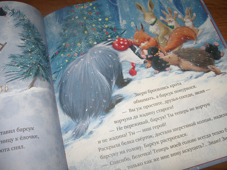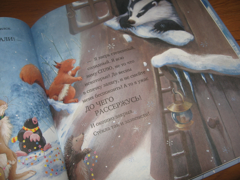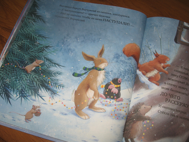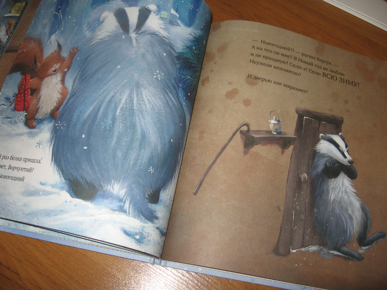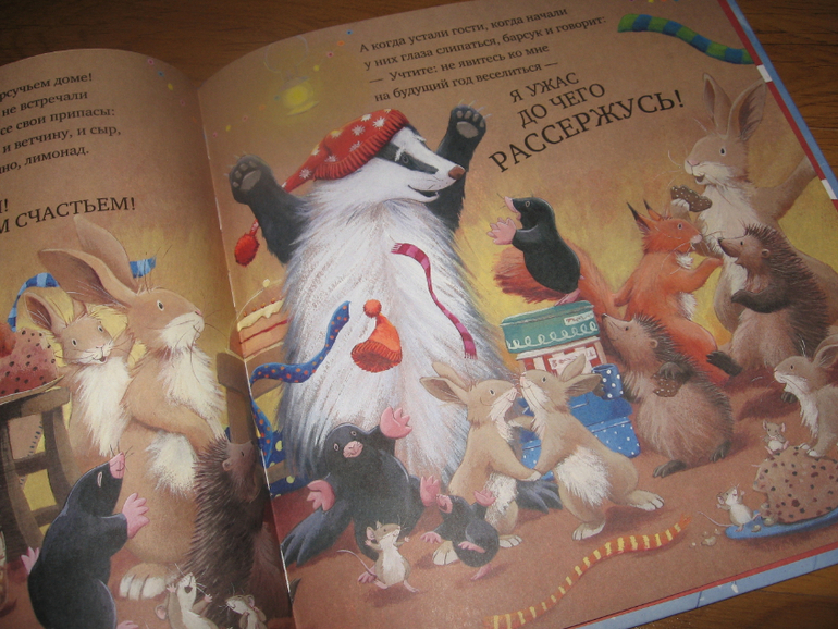 Эта книга у нас нашлась под елочкой, с расчетом на Алису, конечно. Дочери просто очень нравятся книги-картинки, ей важно рассматривать что-то во время чтения. И вроде бы по возрасту нам с такой литературой можно бы и остановиться, но скидки свое черное дело делают) Хотя я о покупке не жалею, конечно. В любом случае книга долгоиграющая, просто даже полистать ее перед праздником и в шесть, и в десять, и в тридцать лет будет приятно. Атмосфера в книге очень предпраздничная, наполненная ожиданием чуда и волшебства. Мне, кстати, само ожидание и подготовка нравятся больше самого праздника)) В книге волшебства не случается, а чудо все-таки происходит. Сердитый барсук перевоспитывается, и у него завязывается дружба с остальными обитателями книги. Сюжет очень простой, но я книгу покупала по большей части из-за рисунков, а они просто замечательные)