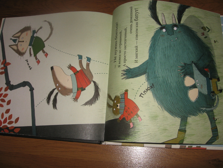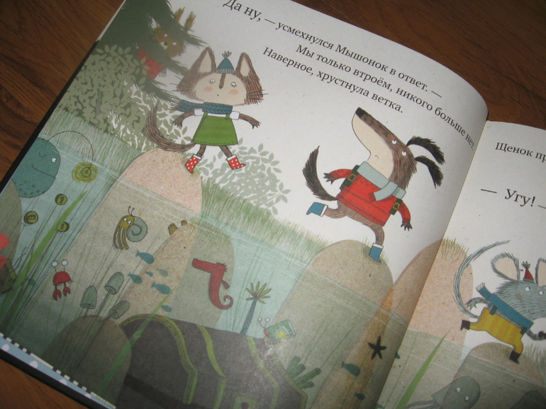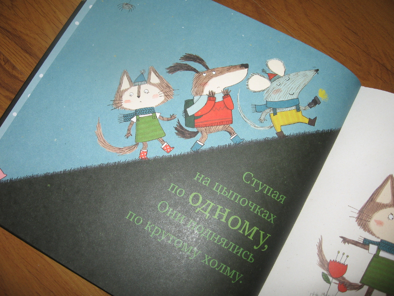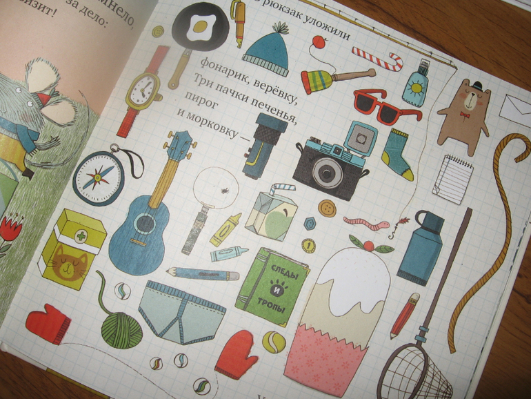 Эту книгу я купила исключительно для себя)))) Очень уж мне она понравилась, да еще тут в ДК про нее так хорошо рассказывали, что покупка была делом решенным. А дети тоже с удовольствием слушали. Егор пару раз прочитал ее самостоятельно, буковок мало и все они крупные, чего же не прочитать-то. Для Алисы большим плюсом оказалось наличие кучи мелких деталей, которые можно долго-долго рассматривать, а еще книгу нужно поворачивать по ходу чтения, это тоже показалось забавным для нее. Еще, начиная с обложки, Алиса "выравнивала героям поверхность", чтобы они шли по прямой, а не на крутую горку, а то мало ли что, вдруг упадут))) Ну и если читать с нужными интонациями, то можно немного пощекотать нервишки, побояться немного, а потом ... рррраз... и все хорошо закончилось) Особенно забавно проиллюстрирован этап сборов, когда к строчкам "В рюкзак уложили фонарик, веревку, три пачки печенья, пирог и морковку..." дорисовали гитару, сачок, солнцезащитный крем и трусы (то ли запасные, то ли для купания).