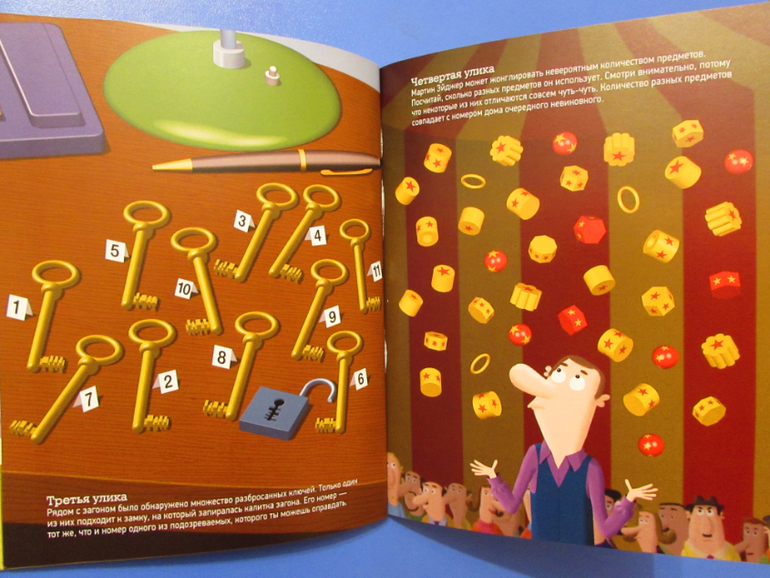 Если же с какой-то задачей возникают трудности, ответ можно подсмотреть в конце каждой истории. Для того чтобы их прочитать придется перевернуть книгу и воспользоваться зеркалом. Правильные ответы написаны в зеркальном отражении.