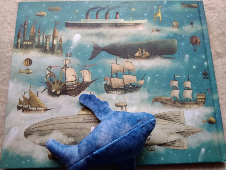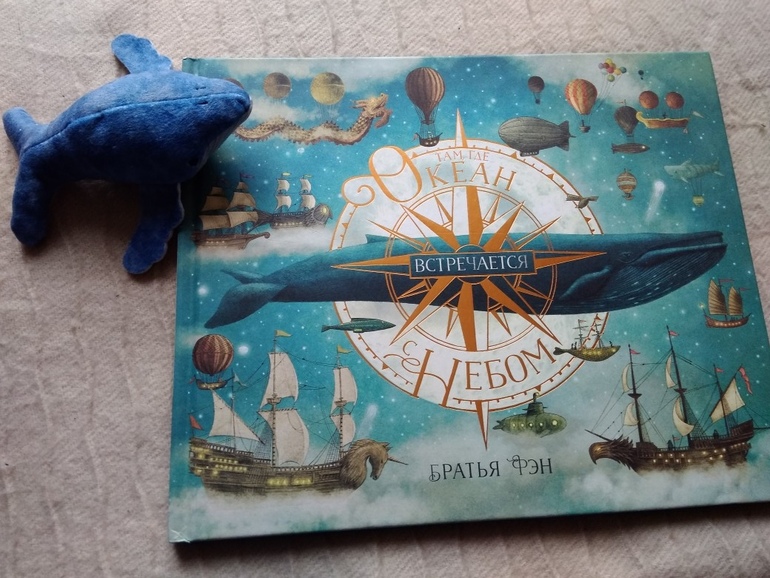 отзывыЯ эту книгу сразу купила. Хотя обложка ее мне в анонсах показалась слишком вычурной и перегруженной, ну в самом деле - чего там только нет! И корабли, и батискафы, и воздушные шары, и дирижабли, и даже дракон имеется, причем, не европейский с лапами и крыльями, а типичный китайский - то ли головастая змея, то ли безногая бородатая ящерица... Плюс синий кит поперек обложки, разделяя ее телом на две половины и пересекая золоченый лимб с шестнадцатилучевой геральдической звездой розы ветров, в который вписано название книги - Там, где Океан встречается с Небом.