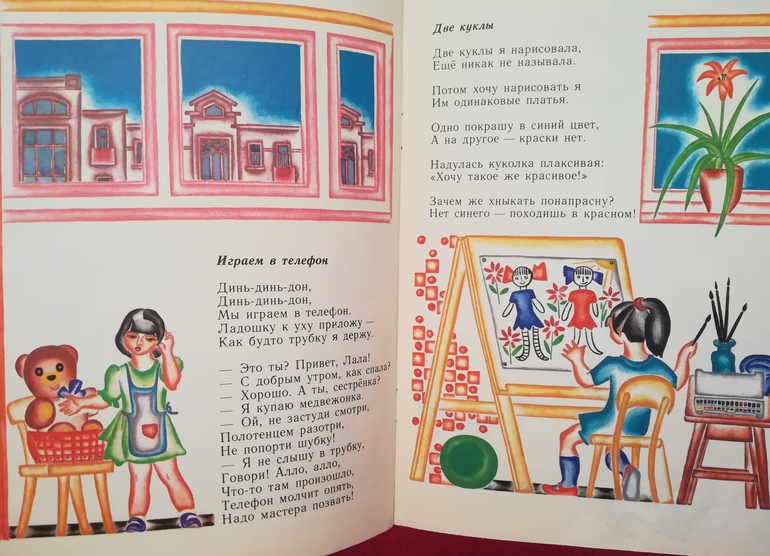 Тут про телефон - очень нравилось дочке, и про кукол - я это стихотворение написала на поздравительной открытке, когда у подруги родились близняшки, и приложила одинаковые девочковые красные и синие ползунки с цветочками и божьи коровками.