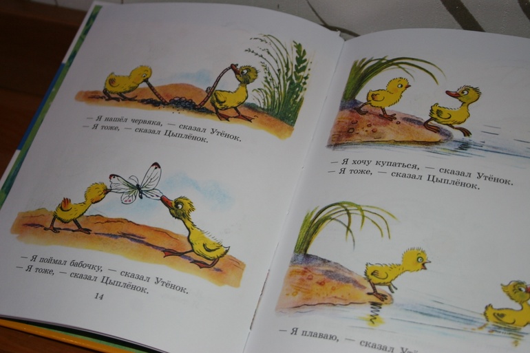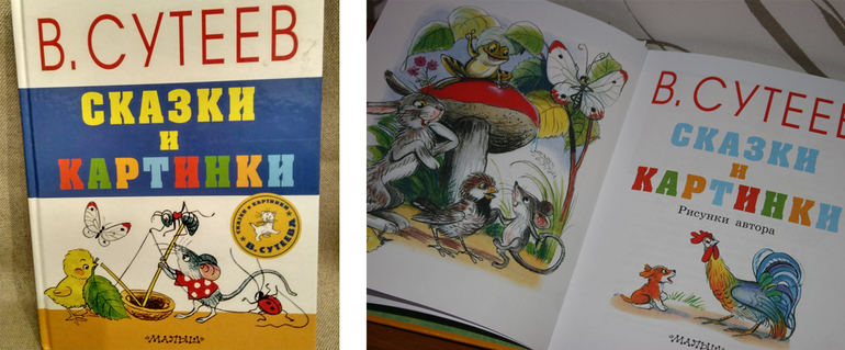 Сутеев меня не смущает. Меня книга смущает))) Она большая и довольна тяжёлая. Никак не ассоциируется у меня с первыми книгами для малышей. Есть ведь Сутеев и в другом формате. Например, книжки-раскладушки. Странички у них толще, размер книжек меньше, детки лучше воспринимают такие книги. А сборник...