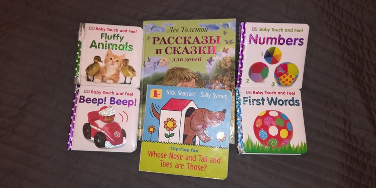 А маленькие книжки все зачитаны до дыр обеими дочками. Маленькие книжечки - тактильные, очень хорошенькие. А книга про собаку с окошками. Тоже пользуется до сих пор популярностью)