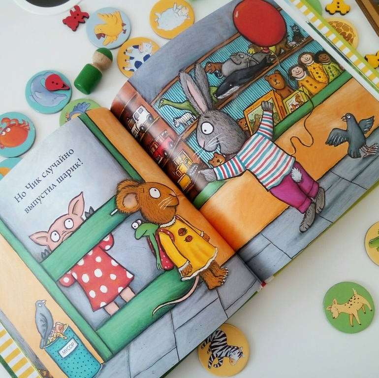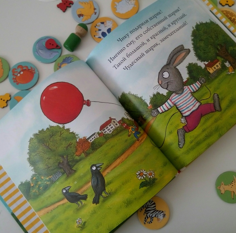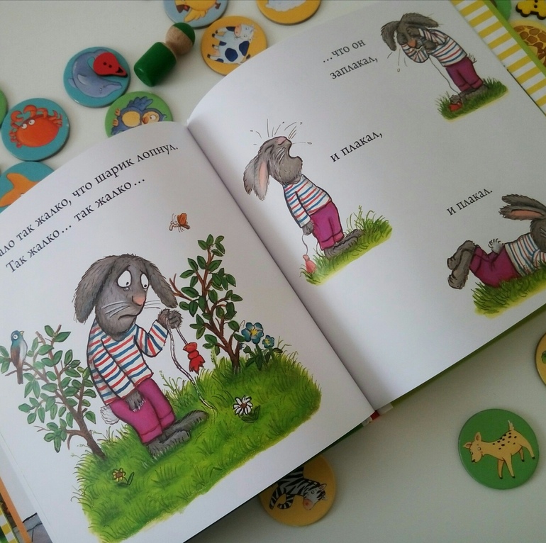 Книжку можно просто читать, а можно обсуждать с малышом эмоции: попросите малыша показать "как зайчик радуется", "как зайчик плачет". Можно додумывать сюжет, рассматривая картинки: "Почему зайчик выпустил шарик? на что же он загляделся?". Можно использовать эту книгу как первый виммельбух: "найди кошечку", "покажи рыбку".