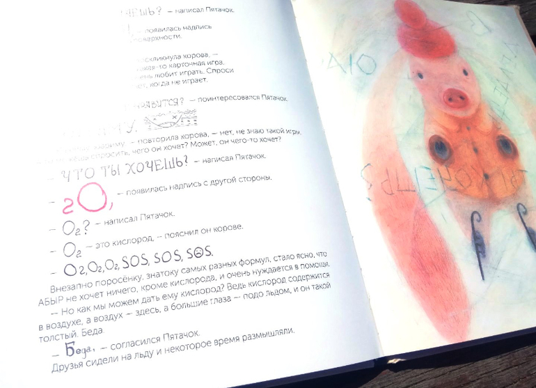 Автор очень постарался, чтобы эта книга отличалась от тысяч других книжек-картинок. Эта же задача была поставлена и перед художником. Ведь как еще объяснить, что фантазия художника выдала нам симпатягу-поросенка с такими длинными ушами и очень изящную корову на льду. Как еще объяснить, что спокойные, будто размытые иллюстрации воспринимаются яркими и завораживают своей сказочностью.